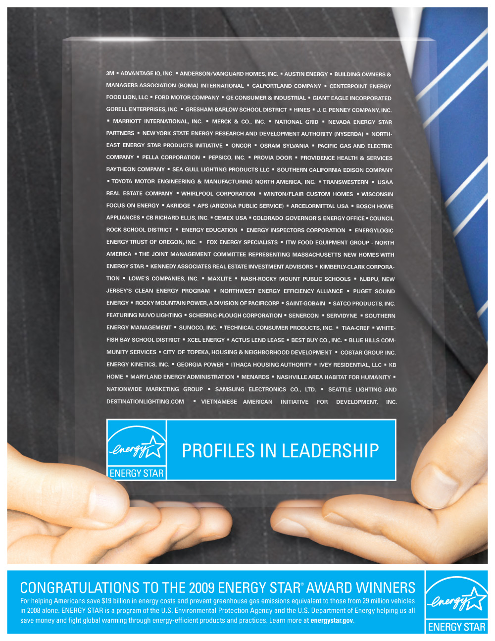 About: Full page spread designed to recognize the 2009 ENERGY STAR Partners of the Year, corporations that were demonstrating leadership in energy efficiency and reducing their carbon footprint.