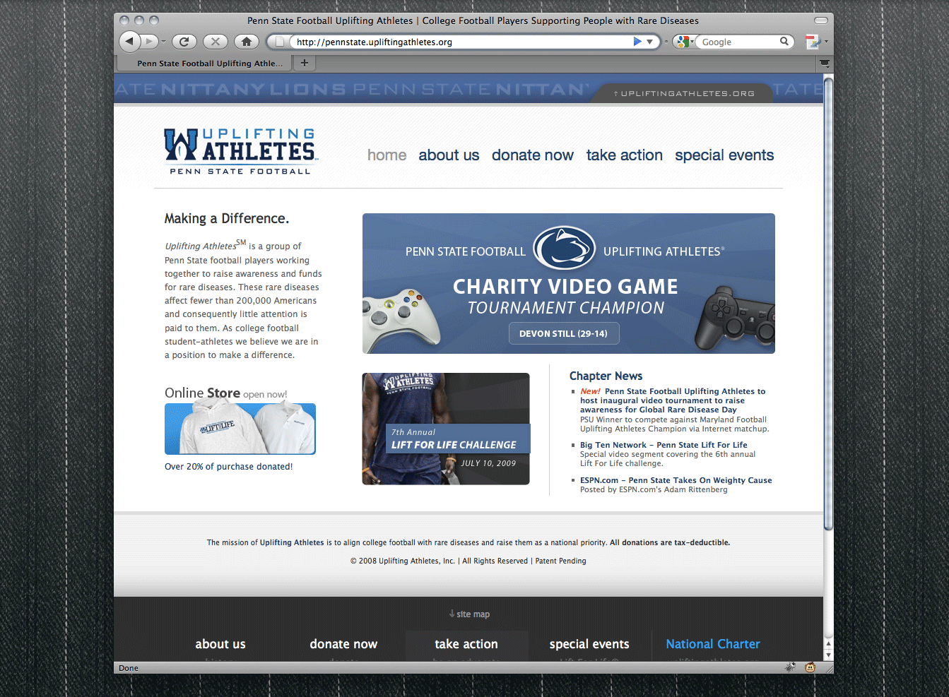 About: As a growing national nonprofit organization, Uplifting Athletes, Inc. needed a corporate website design that was easily templated to support its growing network of university chapter subsites. Below you can see the national Uplifting Athletes, Inc. charter site (left) compared to the Penn State Football Uplifting Athletes chapter iteration (right). (HTML/CSS/JAVASCRIPT)