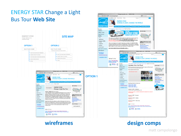 Responsibilities: Wireframes, Design. Created to support a national bus tour with over 20 stops, starting in San Francisco, CA and ending in Boston, MA.